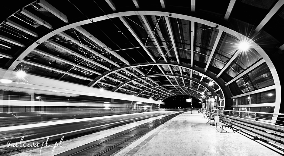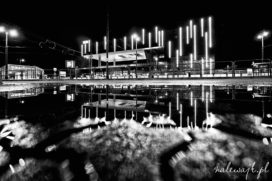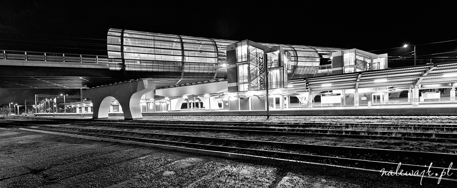 Architektura miasta nocą, w kolorze oraz w czerni i bieli, jeden z moich ulubionych tematów fotograficznych. Tym razem zapraszam do obejrzenia zdjęć nowego obiektu budowlanego na mapie Bydgoszczy, dworzec kolejowy, połączenie nowoczesnej architektury budynku ze szkła i stali oraz zabytkowego budynku dworca, od nie dawna jedna z wizytówek architektonicznych miasta. Inwestycja budziła i nadal wzbudza wiele kontrowersji mieszkańców, przyjezdnych gości, pod względem estetycznym, funkcjonalnym i dopasowania do otoczenia.